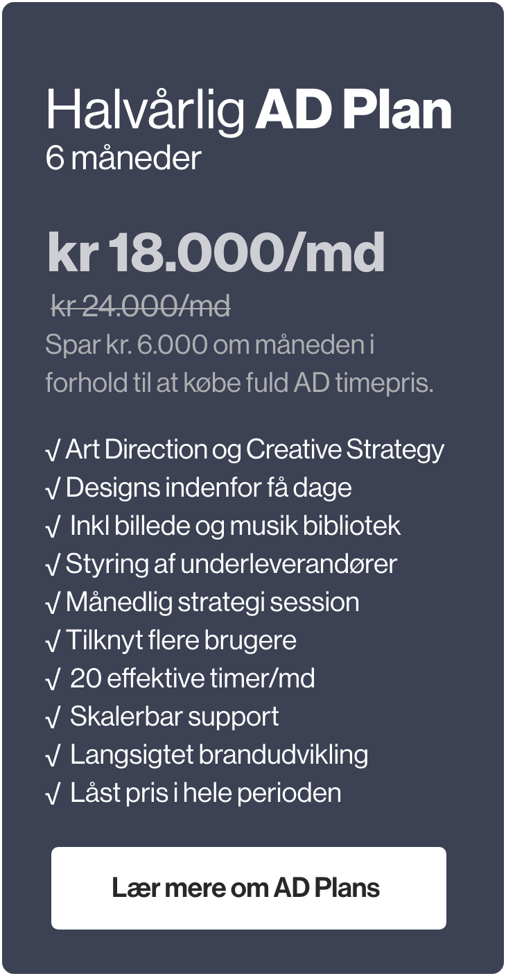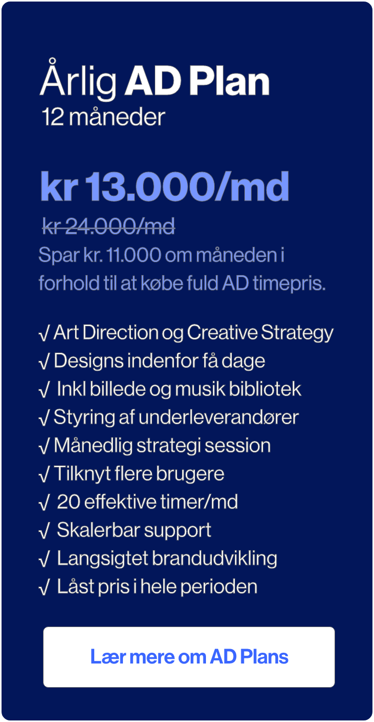 Godt spørgsmål. Hvis man ønsker at ansætte en AD’er, skal man først finde ca. 800.000 kr. pr. år i budgettet for at hyre en senior designer – plus udgifter til ferie og eventuel inaktiv tid hos en medarbejder. Desuden kan det være ganske udfordrende at finde en exceptionel designer, der er både ledig og villig til en in-house-ansættelse.